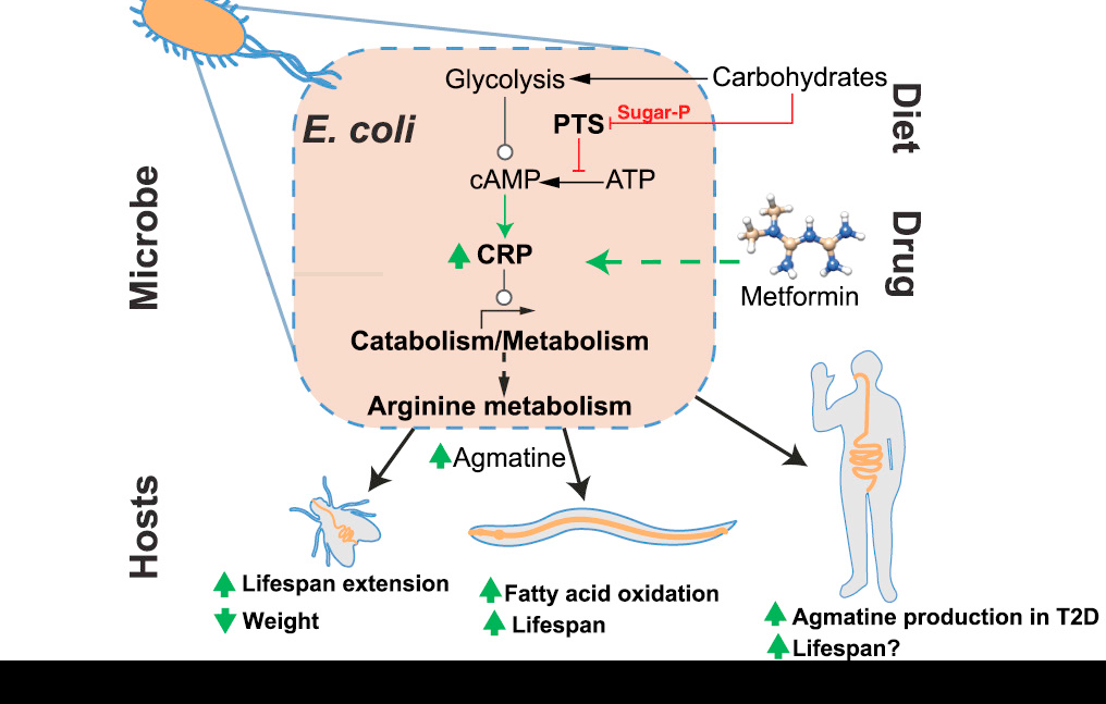 This study looked at how gut bacteria can alter the affect of drugs and nutrients on a host organism. It used the worm host C. elegans and the gut bacteria E. coli for high-throughout multi-omics screening. Data analysis of this four-way screen combined with metabolic modelling showed that microbes integrate cues from metformin and the diet through the phosphotransferase signaling pathway that converges on the transcriptional regulator Crp.